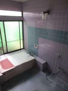 築40年以上経った在来工法のタイルによる浴室です。タイルにヒビや欠け落ちている箇所もあります。