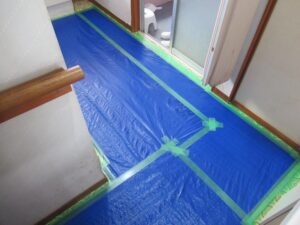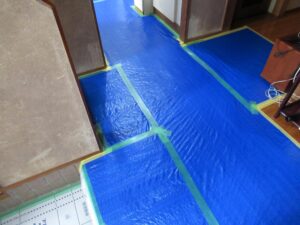 厚手のシートの上に、ブルーシートを敷き、二重にしてしっかり養生します。