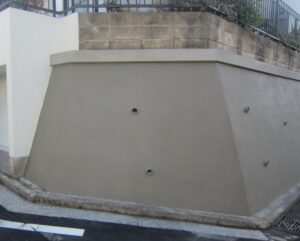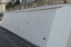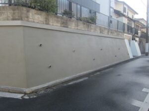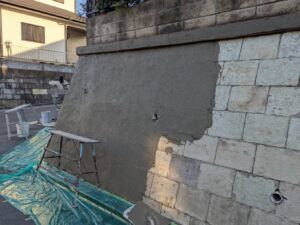 今回の間知ブロック擁壁の表面補修工事は、 モルタル仕上げ を採用しています。