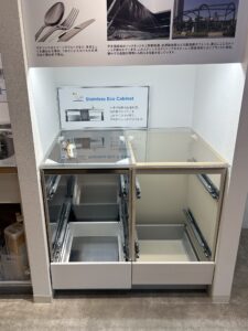 他社のキッチンは木製キャビネットなので、ステディアとセントロのステンレスキャビネットは、ステンレスに強いクリナップだからこその仕様ということがわかります。