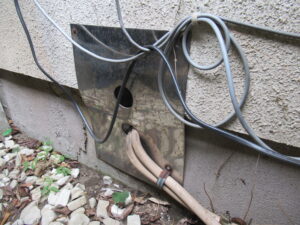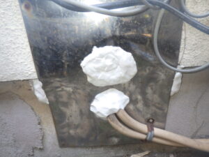 ネズミの侵入経路として多いのは基礎の通気口ですが、今回は建物外部を確認した結果、給湯器の追い炊き配管まわりのステンレスプレートの隙間が侵入口として疑われました。