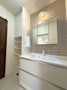 収納スペースの吊戸棚を左サイドに持ってくることで、タイルが素敵な洗面台となりました。